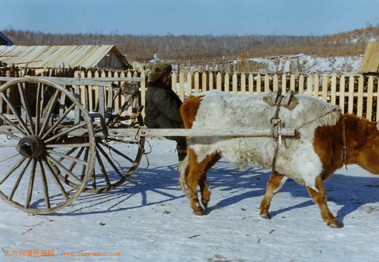 915 Big wheel vehicle Location: Tuo river in 1981, Oroqen people pulling firewood with big wheel vehicle after settlement.